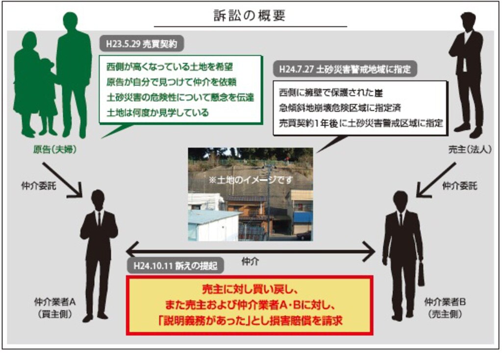 土地の冠水履歴や液状化ハザードマップ上、過去に液状化した可能性が高い土地や、土砂災害警戒区域に近接する土地など、土地の性状に関するトラブルの法律相談を多く受けております。最近の判例では、将来、土砂災害警戒区域に指定される可能性があることについて説明をしなかったということで、仲介業者の調査・説明義務違反を認定した判例があります。