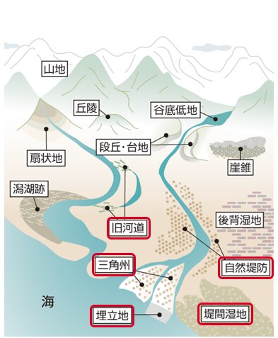 液状化し易い条件が存在する地形は沖積低地(砂丘末端緩斜面、砂丘・砂州間低地、旧河道・旧池沼、干拓地、自然堤防、三角州・海岸低地など)に多く存在します。