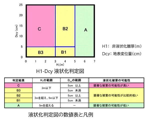 原位置地盤調査の評価は、液状化の概ね3段階、顕著な被害の可能性が「高い・比較的低い・低い」の段階評価がなされており、被害の度合いが対策実施の判断指標となっています。