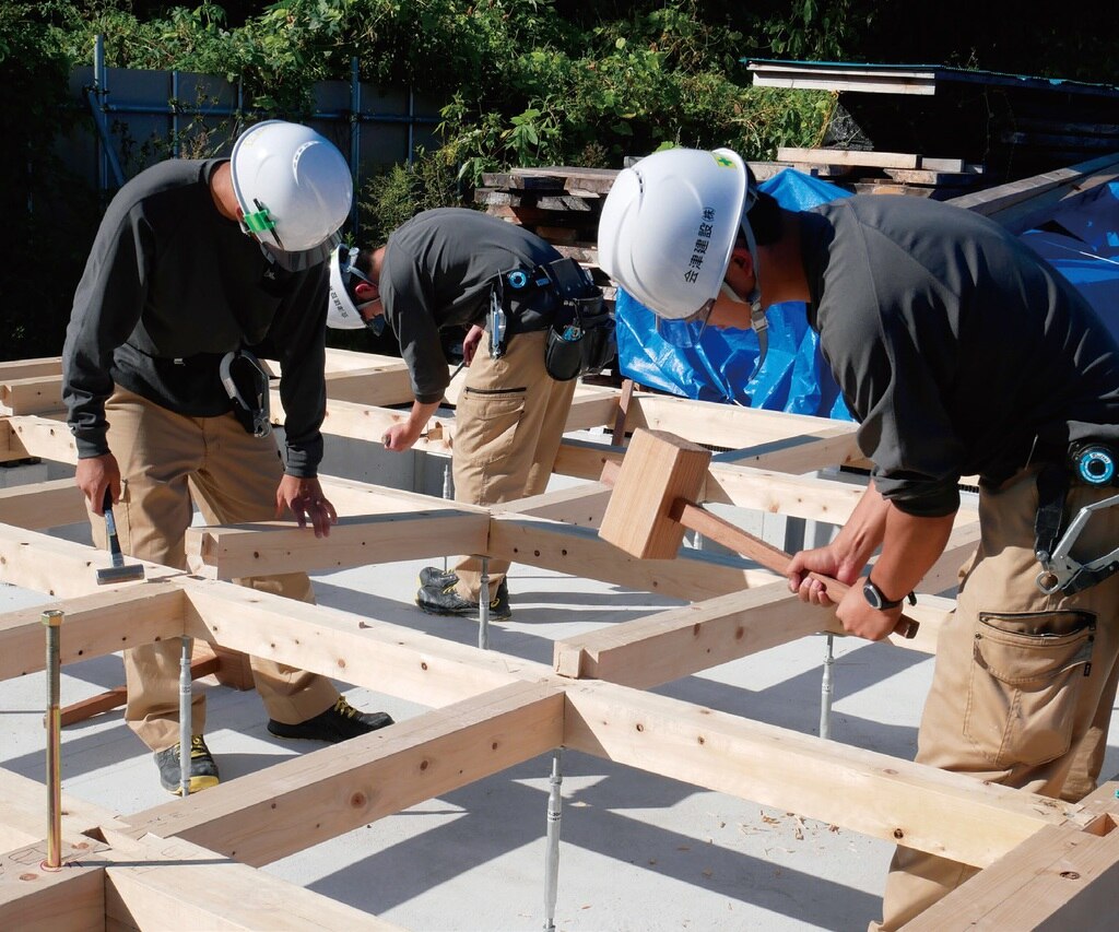 2020年、大工育成の取り組みの一環として、新たなプロジェクトを実施しました。経験5年未満の若手大工だけで、お客様の住宅を施工したのです。構造材の墨付けから上棟、内装の仕上げまで若手大工だけで行い、1棟を完成させました。ベテラン大工2人がついてはいましたが、手は出さず、必要に応じて指示を出すだけでした。