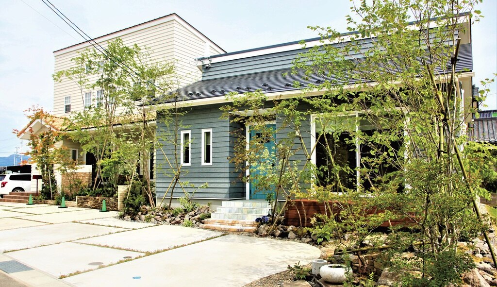 若手大工が完成させた、ブルーグレーを基調としたアーリーアメリカンスタイルの外観