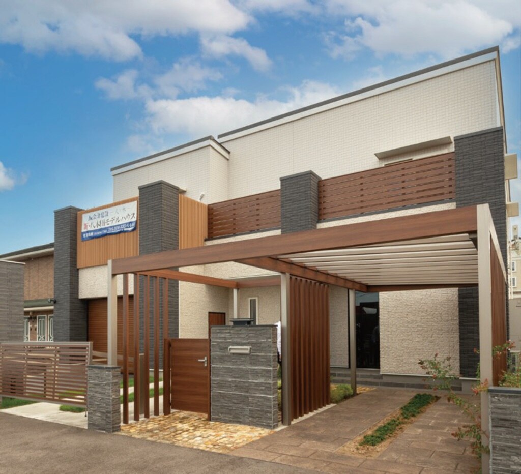 福島市内のモデルハウス。モダンな外観だが、中には大工の腕を 発揮した和室や格子のデザインをあしらった