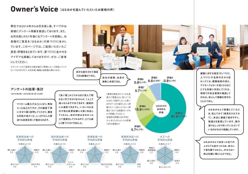 はなおかのパンフレットOwner’s Voiceより「大工への平均的な評価」(5段階評価)はすべての項目で4.5以上の評価です。「親しみやすさ」での高評価が光っています。