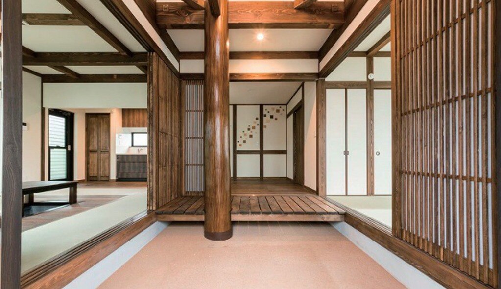 艶めく大黒柱、そこから渡された現しの梁、一体感を覚える吹き抜け、真砂土を用いた土間や畳の部屋が設けられた真壁づくり。