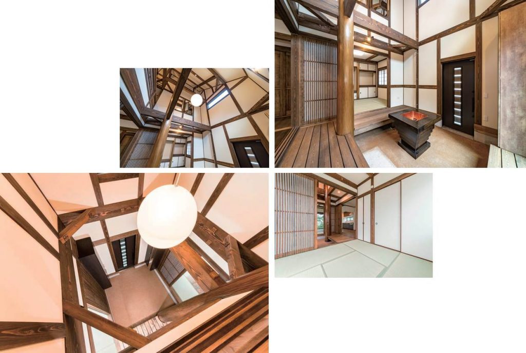 左上/寝転んで眺めたいアートのような梁。視覚的にも安心感を与え、織りなす形は豊かな心を育んでくれそうです。 右上/大地の呼吸を感じる土間。広い昔ながらの土間は、家族が一つになる心を育んでくれることでしょう。 左下/吹き抜けのある広い玄関。開放的な空間のため、そこに住まう家族みんなを感じることができます。 右下/空間にマッチする和みの畳。畳のある空間は、優しく安らぎを与え、かつ凛とした厳かな雰囲気も私たちに与えてくれます。