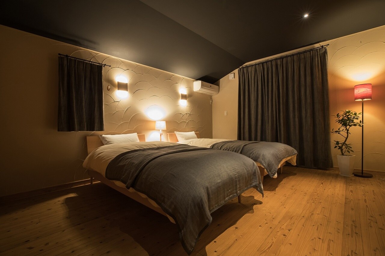 究極の寝室」/炭で塗られた天井、調湿効果が高い「稚内珪藻土」を使った壁が特徴。抗酸化効果があるとされるSODリキッドを室内の壁や天井に吹き付けて仕上げる