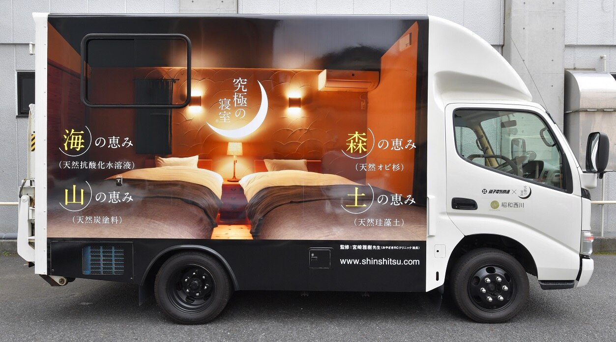究極の寝室」の展示車/トラック荷台部分の内部を「究極の寝室」にした。展示会などで活用する。