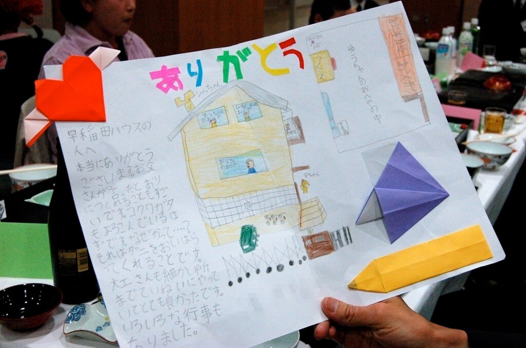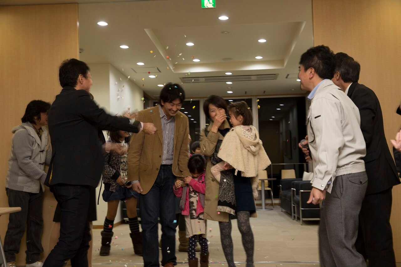 お客様が入居して2~3カ月後に、お客様とそのご両親や親戚を招いて、現場に携わった職人さん、社員も一堂に会した新築完成祝賀会を催します。祝賀会はご主人の入場から始まり、各人のあいさつ、スライドで施工過程を振り返るなど結婚披露宴さながらで、大変盛り上がるそうです。